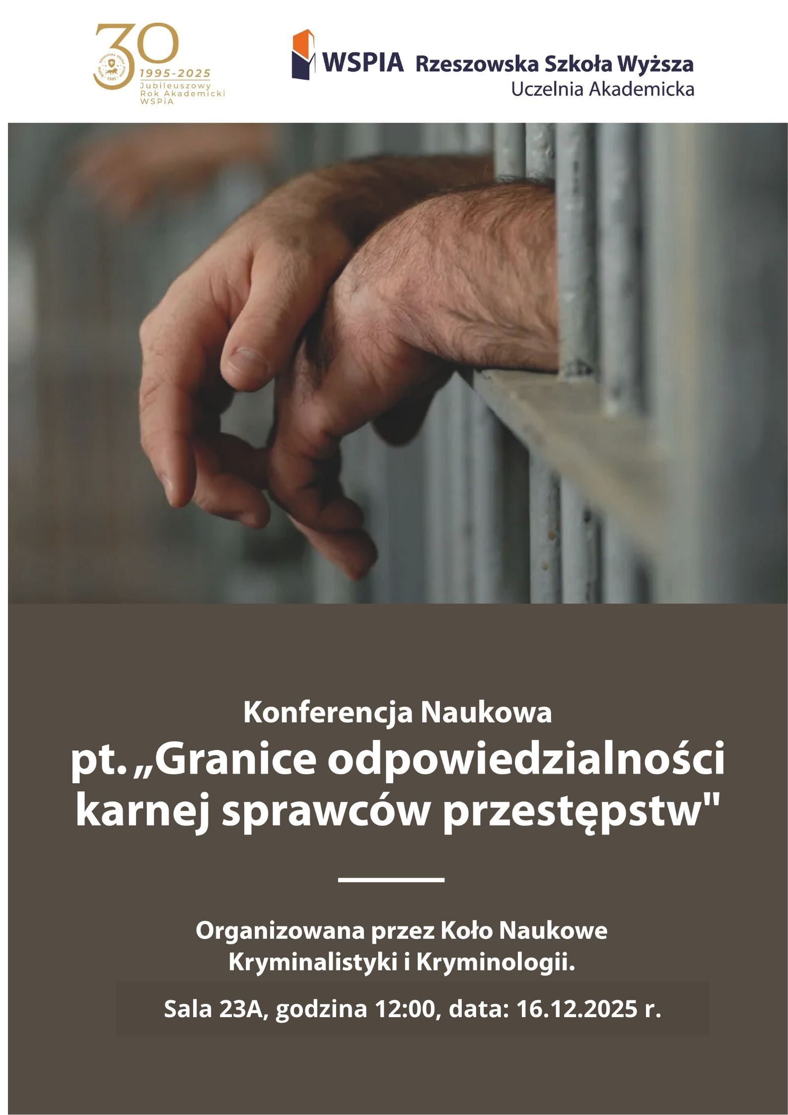 W dniu 16 czerwca zapraszamy na Konferencję Naukową pt. Granice odpowiedzialności karnej sprawców przestępstw", organizowaną przez Koło Naukowe Kryminalistyki i Kryminologii. Sala 23A, godzina 12:00.