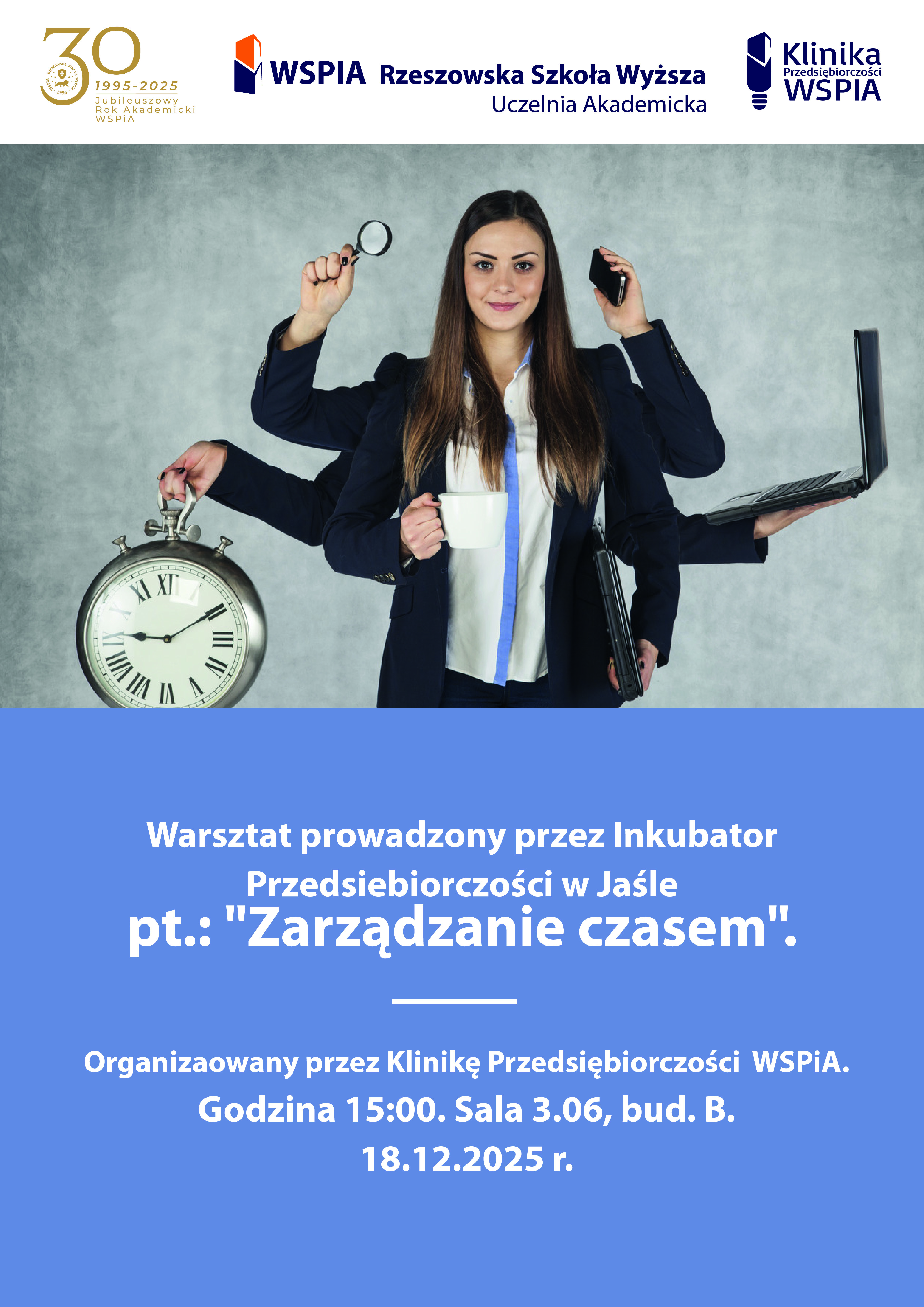 18 grudnia odędzie się także warsztat prowadzony przez Inkubator Przedsiebiorczości w Jaśle pt.: "Zarządzanie czasem". Wydarzenie organizaowane przez Klinikę Przedsiębiorczości WSPiA. Godzina 15:00. Sala 3.06, bud. B.