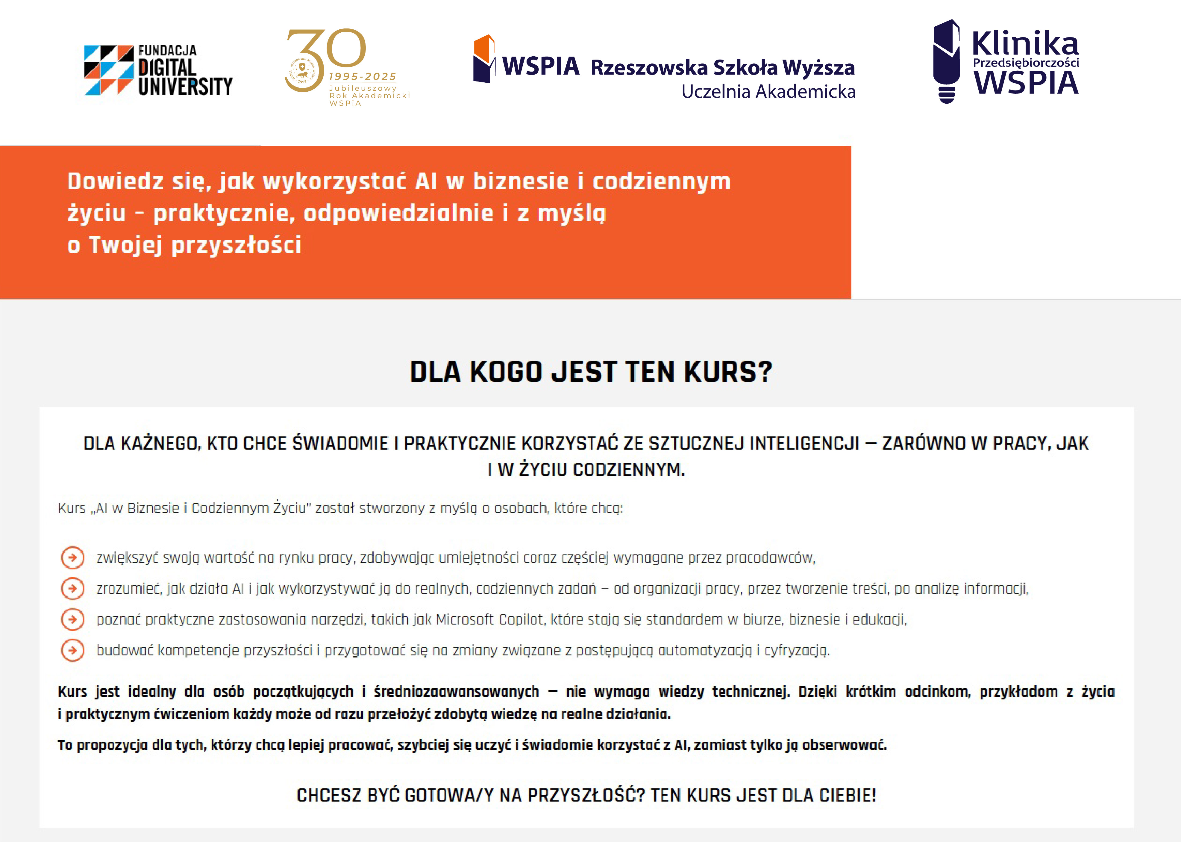 Dodatkowo Klinika Przedsiębiorczości WSPiA zaprasza na darmowe szkolenie z AI. Za ukończenie kursu przysługiwać będzie certyfikat, który należy przesłać na adres praktyki@wspia.eu w celu otrzymania punktów MIX'a. Po otrzymaniu certyfikatów zostaną Państwu wystawione karty punktów MIX'a (3 punkty MIX'a). Więcej szczegółów pod linkiem: Darmowe szkolenie AI