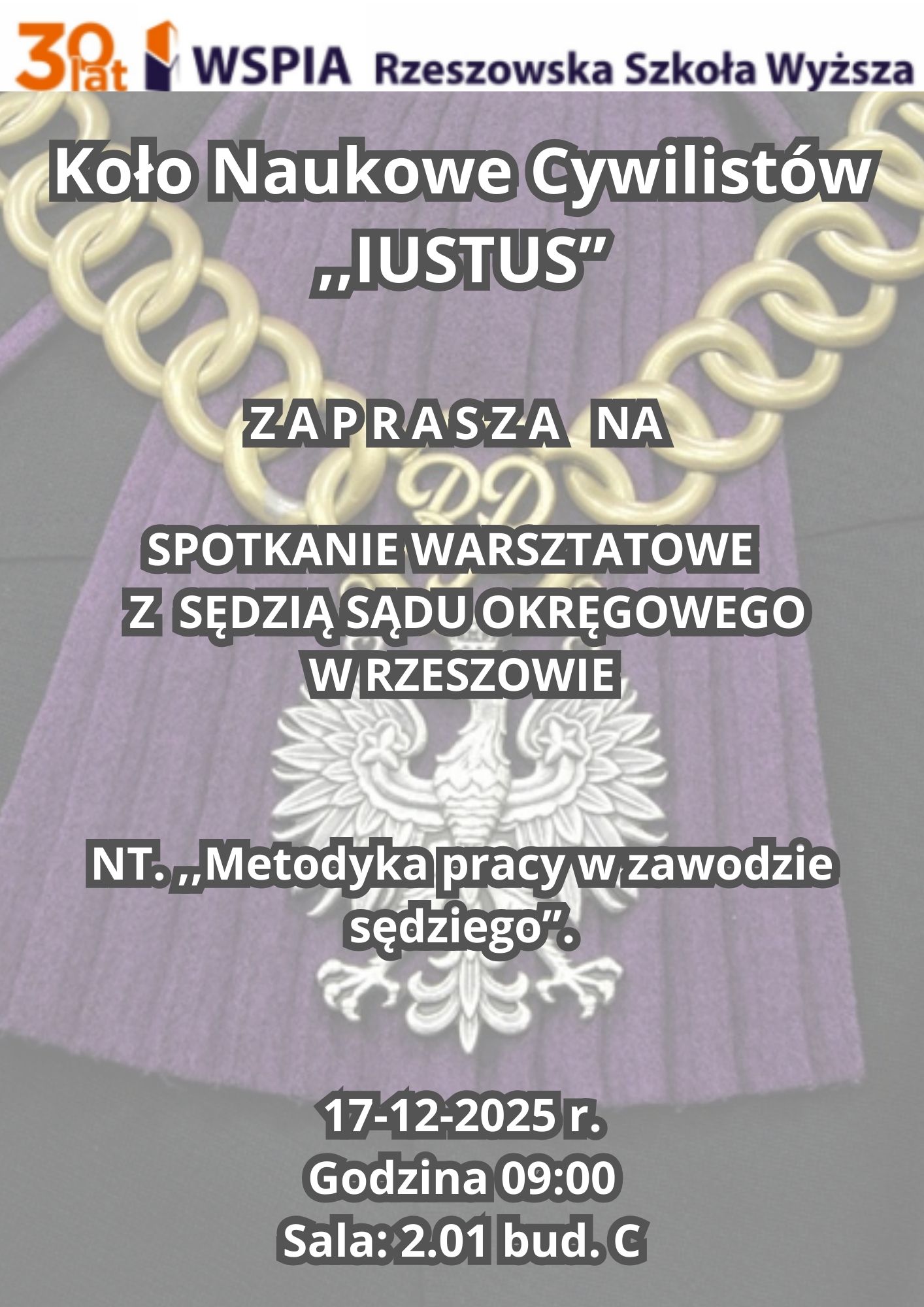 W dniu 17 grudnia o godzinie 9.00 w sali 2.01 bud. C., zapraszamy na spotkanie warsztatowe z ciekawym człowiekiem - Sędzią Sądu Okręgowego w Rzeszowie, Panem mgr Łukaszem Oliwą, organizowane przez Koło Naukowe Cywilistów Iustus.