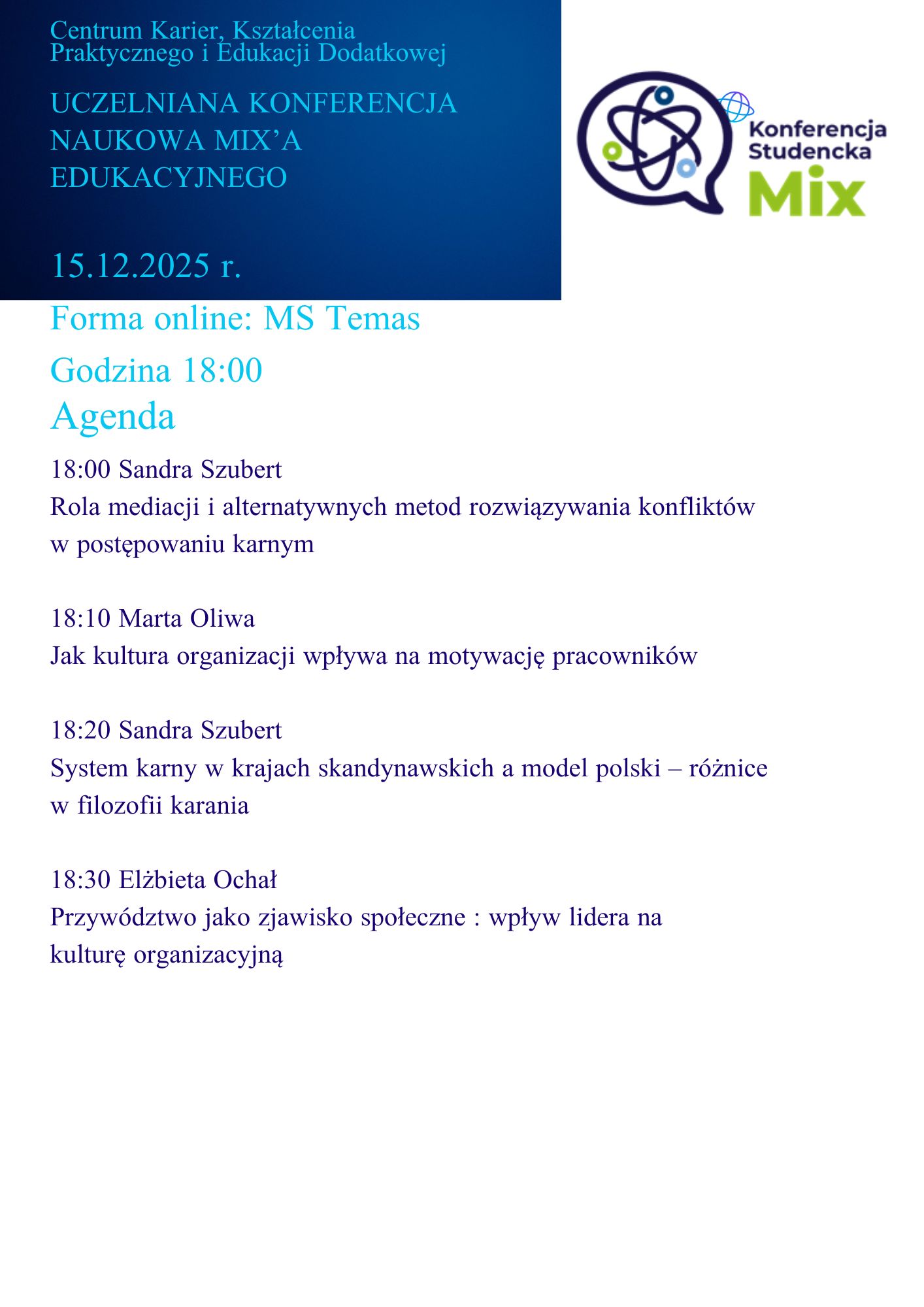 Konferencja Naukowa MIX'a Edukacyjnego. Godzina 18:00, forma online. Link: Konferencja MIX'a Edukacyjnego | Dołączanie do spotkania | Microsoft Teams