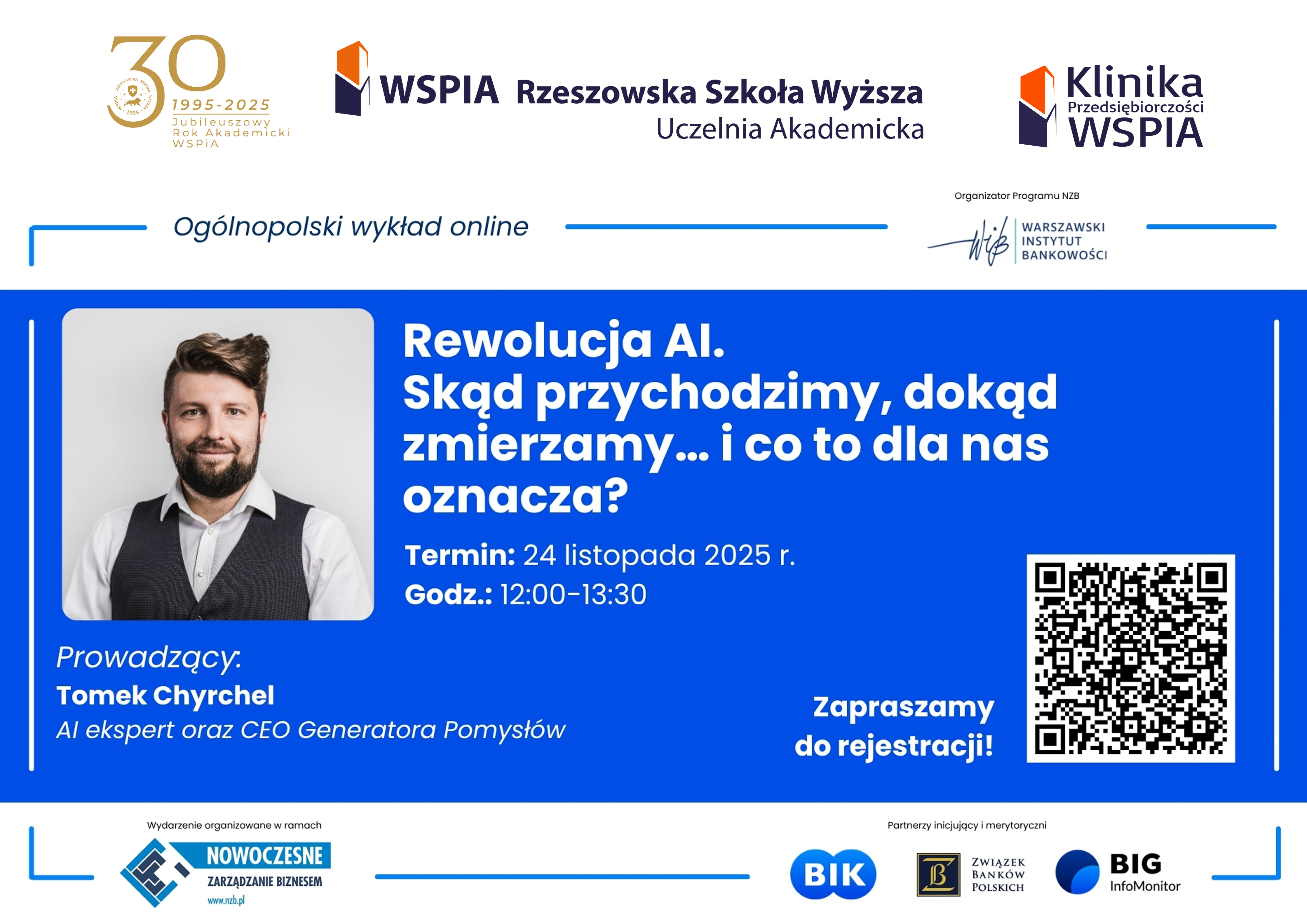 - Klinika Przedsiębiorczości zaprasza na wykład online pt.: „Rewolucja AI. Skąd przychodzimy, dokąd zmierzamy… i co to dla nas oznacza?”, który poprowadzi Tomek Chyrchel, realizowany przez Warszawski Instytut Bankowości o godzinie 12:00. Każdy z Uczestników otrzyma imienny certyfikat, którego skan należy przesłać na adres praktyki@wspia.eu w celu uzyskania punktów MIX'a. Wymagana wcześniejsza rejestracja. Link: