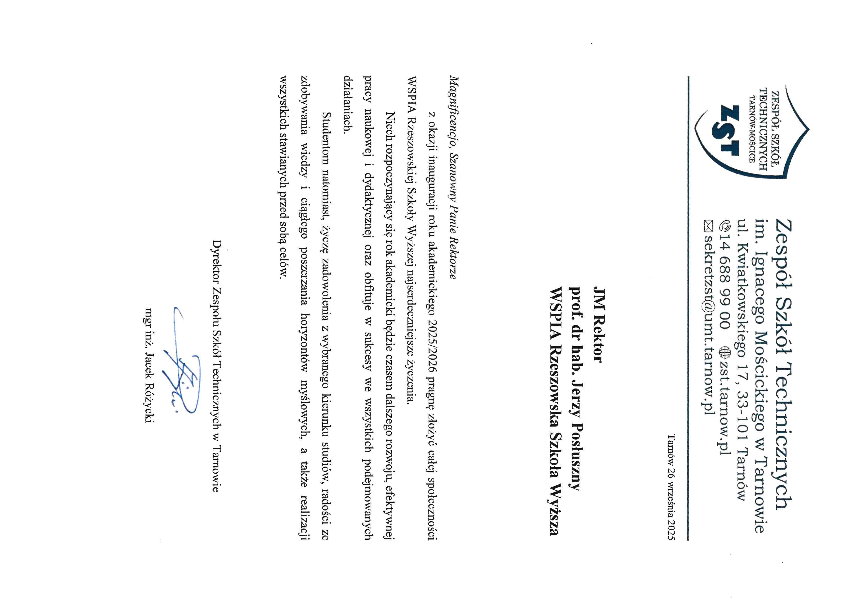 - Mgr inż. Jacek Różycki – Dyrektor Zespołu Szkół Technicznych w Tarnowie