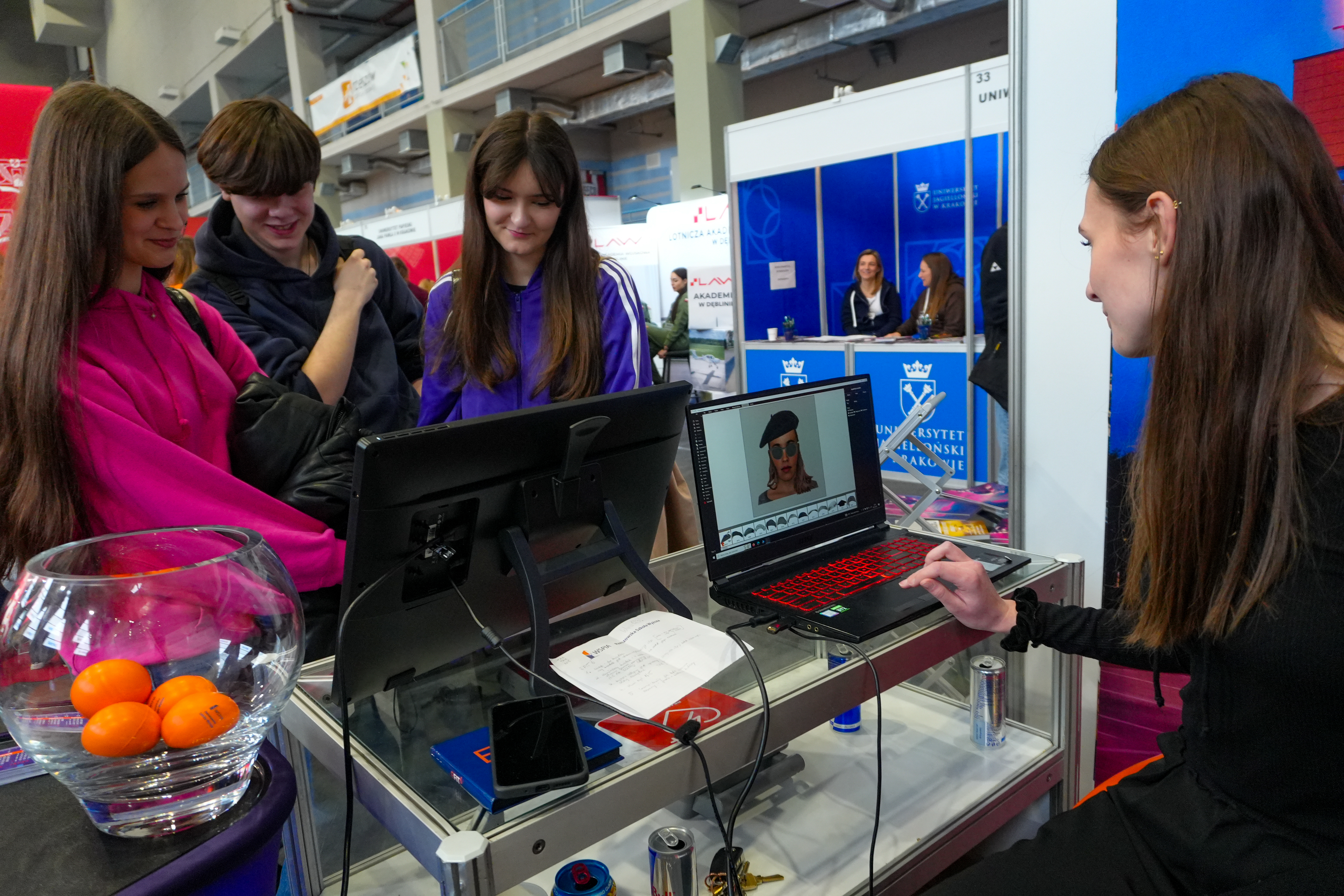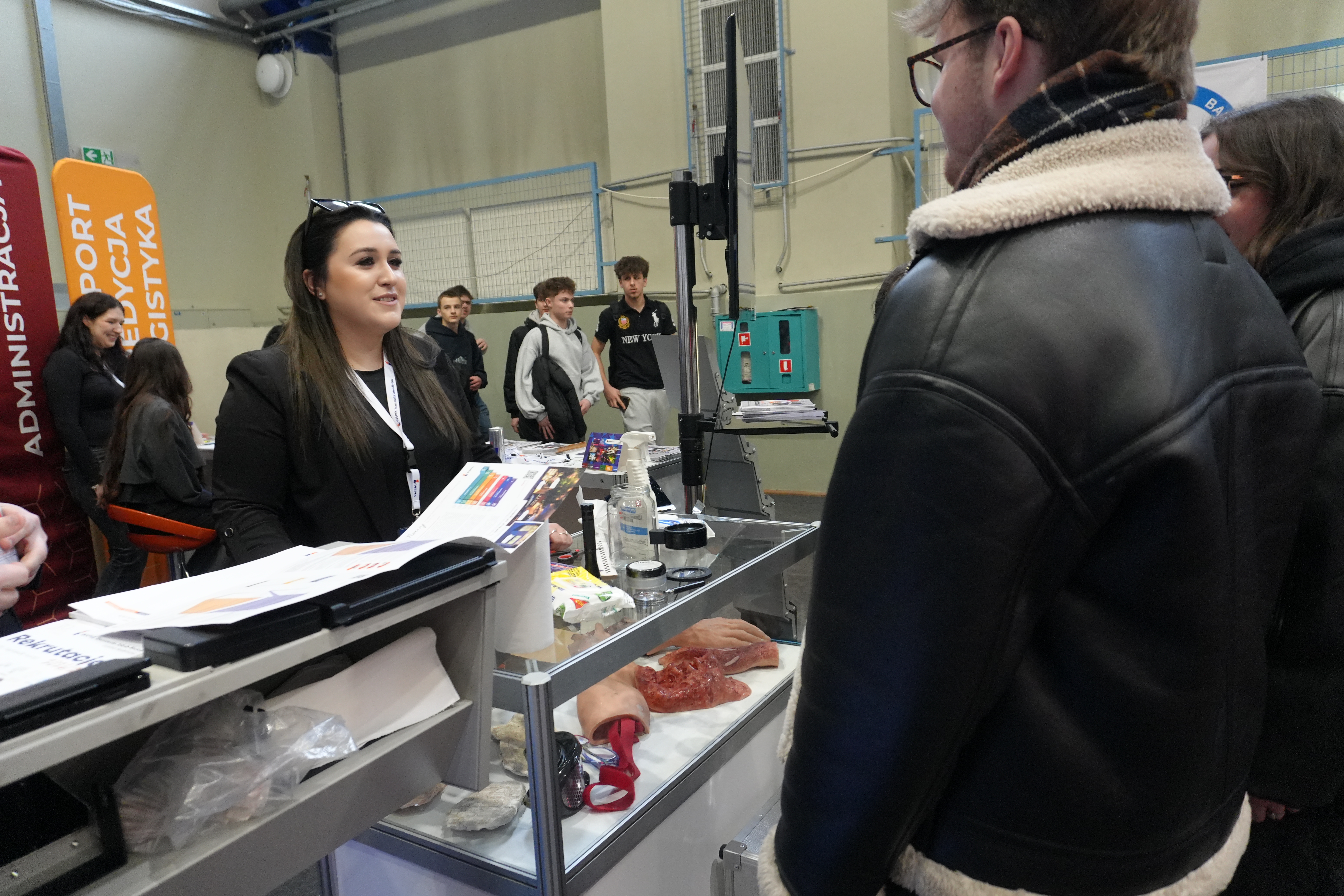 Stoisko WSPiA - podobnie jak pierwszego dnia - tętniło życiem. Uczniowie mogli zobaczyć na żywo działanie wariografu, wykonać odbitki swoich linii papilarnych oraz przyjrzeć się sprzętowi wykorzystywanemu w Pracowni Działań Ratowniczych. Te elementy nie były jedynie widowiskową atrakcją. Dla wielu młodych osób stanowiły dowód, że za kierunkami studiów w naszej Uczelni stoją realne kompetencje i konkretne umiejętności.