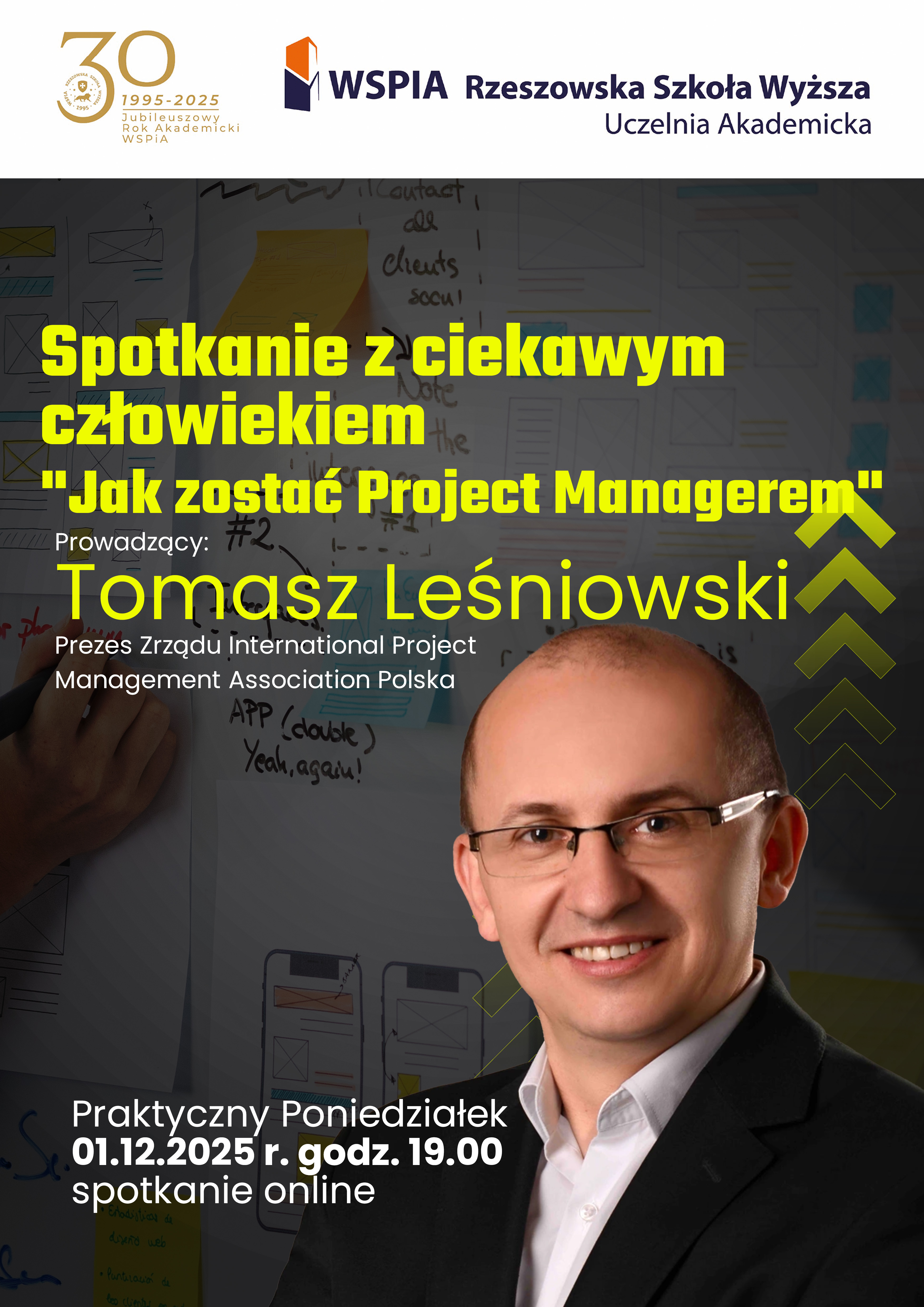 19:00 – Spotkanie z wyjątkowym gościem – panem Tomasz Leśniowski, Prezesem Zarządu International Project Management Association Polska, który poprowadzi wykład „Jak zostać Project Managerem”. W trakcie webinaru omówione zostaną podstawowe pojęcia związane z realizacją projektów oraz pierwsze kroki w karierze Project Managera – online.