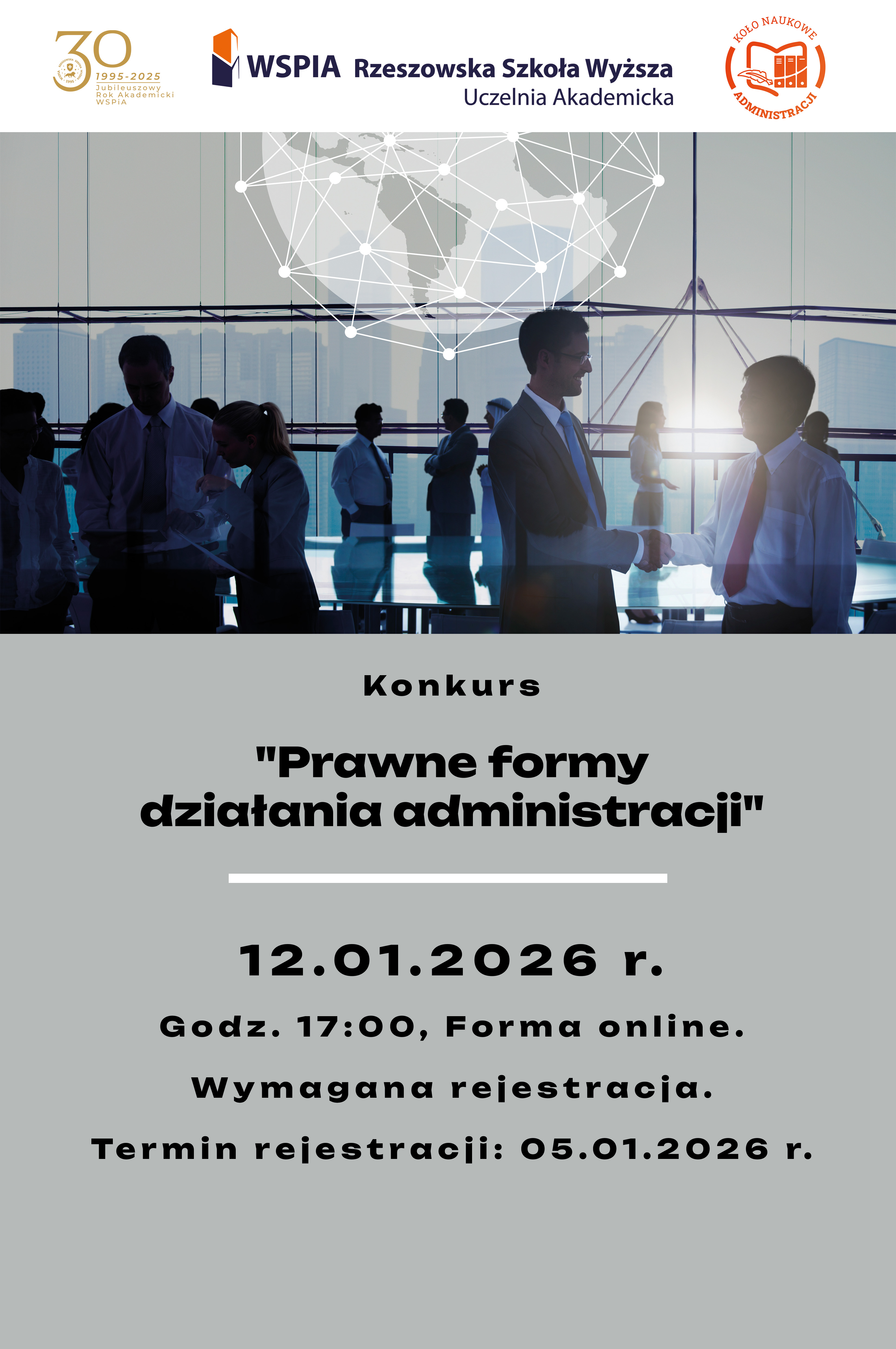 - 12 stycznia 2026, 17:00 - Konkurs "Prawne formy działania administracji", organizowany przez Koło Naukowe Administracji (Wymagana rejestracja do 5.01.2026)